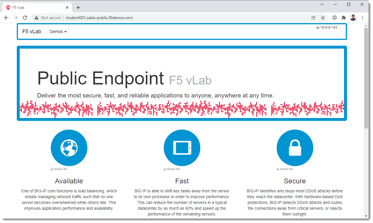 Once the HTTP Load Balancer has been deployed, you should now be able to go to the DNS name that you entered previously in a web browser. The FQDN we used in our example is http://x-surname.public.f5-consult.f5pslab.com. Your FQDN should follow the format of [unique name].[supplied domain name for your tenant].
